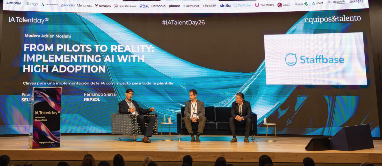 Las claves para implementar la IA con impacto para toda la plantilla centraron la mesa redonda “From pilots to reality: implementing AI with high adoption”, en la que Firas Atassi, Chief Information Security officer & Data Protection officer SEUR, destacó que trabajar con la IA es “un caso de confianza y liderazgo. Y así, combinando la confianza y el liderazgo y a través de las personas es como los proyectos tienen éxito”. Para Atassi, existen tres focos: satisfacción clientes, satisfaccion con colaboradores y empleados, y satisfacción para el accionista. Así puso el acento en que “hay que crear entornos seguros con datos reales” y afirmó que: “Si convences al escéptico, atraerás a toda la organización. Eso sí, es necesario concienciar en el uso responsable de la IA. El éxito de la IA va a ser el éxito de las personas”. Fernando Sierra, director de Organización y Nuevas Formas de Trabajo de Repsol, declaró que “el impulso de la IA debe producirse de arriba hacia abajo”. Comentó que han invertido más de 14.000 horas en formación, e incidió en la necesidad de acompañamiento. Aseguró que su compañía es “muy activa con las inquietudes de los empleados” a los que tratan de dar siempre respuestas. “RRHH trabaja de la mano de IT para implementar la IA, que utilizamos para ejecutar nuestras tareas a nivel particular, y más allá en un plan sistémico en la compañía, aplicándola en las funciones en distintos ámbitos y haciendo un assestment para conocer su impacto, y así identificar dónde puede tener un mayor valor”. Moderó Adrian Moslehi, Country manager – Spain & Italy de Staffbase, quien señaló que “un 1 % de los CEO globales tienen una estrategia corporativa de la IA bien formada, según el Financial Times. Mientras que el 95 % de pilotos en IA fallan en crear un ROI según un estudio del MIT”.