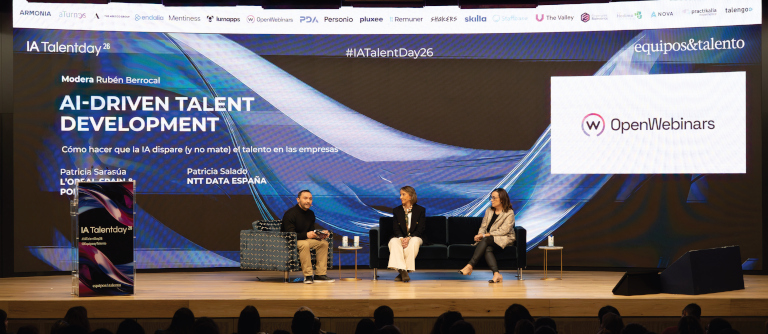 Por su parte, Patricia Salado, head of Talent de NTT Data España, aseguró que: “La IA viene a potenciar el talento a través de un liderazgo que nos permite trabajar comportamientos. Tenemos un reto las organizaciones y es replantearse el talento interno. Esta tecnología viene a repensar esos roles con una automatización que aporta más valor. Y ese máximo valor debe ir acompañado de un upskilling y reskilling”. Han lanzado un programa para trabajar las habilidades necesarias para la IA con equipos multidisciplinares para que la curva de aprendizaje sea lo más rápida posible y donde los managers lideren esta transformación. Moderó Rubén Berrocal, Chief Sales officer de OpenWebinars, quien resaltó que con la IA, “el 50 % de las actividades de tipo administrativo están amenazadas”. Señaló que hay un grado de adopción y exploración, optimización con personalización y una fase de transformación, pero la clave está en las personas que harán que todo sea posible”.