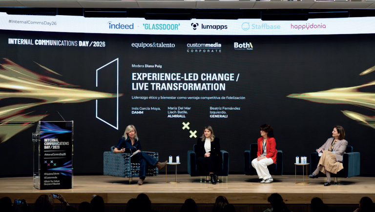 Tras el coffee break, la mesa “Experience-Led Change / Live Transformation”, moderada por Diana Puig, de Both, exploró cómo la transformación se activa desde la experiencia. Inés García Moya, Comunicación corporativa e interna de Damm, presentó “IAmm Xperience”, un proyecto para acercar la IA al día a día de los empleados; Mª Mar Llach, Associate director, Global Culture & Leadership de Almirall, compartió “The Big Bang Culture”, un programa que impulsa la cultura a través de episodios experienciales; y Beatriz Fernández, head of Employee Center & Analytics de Generali, explicó “Leónidas”, un asistente virtual basado en IA que mejora la experiencia del empleado.