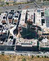 Actualmente trabajan en la construcción unas 1.300 personas, con una previsión en picos de obra de hasta 1.700 personas, incluidos unos 100 técnicos del equipo de diseño, ingenieros, arquitectos y directores facultativos. Poco a poco, se va levantando la estructura elíptica de la torre que alcanzará una altura final de 93 metros de altura y 19 plantas, y que ha sido proyectada, como todo el complejo, por el estudio Herzog & de Meuron.