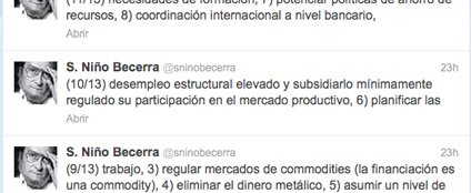 23/08/2013 "Se puede decir de muchas maneras, pero el fondo es muy simple: HOY existe un exceso de oferta de trabajo: de población activa y susceptible de ser activa". Con este tweet, Santiago Niño Becerra ha explicado a través de su cuenta de Twitter cuáles serían las posibles soluciones a los actuales problemas en el mercado laboral.
