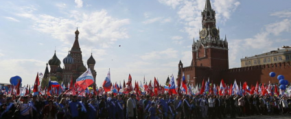 02/05/2014 Miles de personas han participado este jueves en la primera manifestación convocada en la Plaza Roja de Moscú por el Día del Trabajo desde la caída de la Unión Soviética. La zona se ha llenado de pancartas y consignas en apoyo al presidente ruso, Vladimir Putin, al que han alabado especialmente su papel en la crisis ucraniana.