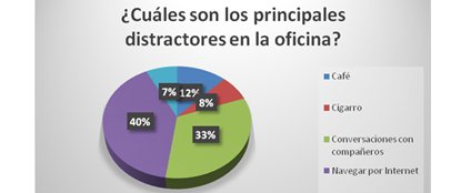 En una encuesta realizada por Trabajando.com a 2.200 personas, el 40% manifestó que una de las principales distracciones en la oficina es “navegar por Internet”, mientras que el 33% mencionó que se distrae hablando con sus compañeros; un 12% en tomar el café; un 8% fumando; y, finalmente, un 7% se distrae hablando por teléfono.