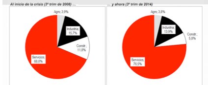 En lo que se refiere a la composición del empleo según sectores económicos, la crisis ha supuesto una caída en la participación de la Construcción (perdió 6 puntos porcentuales, desde el 11,8% hasta el 5,8%) y de la Industria (redujo su participación desde el 15,7% hasta el 13,9%), que benefició a los Servicios, cuyo segmento se amplió (desde el 68,6% hasta el 76,5% antes mencionado). La participación de la Agricultura permaneció casi inalterada.