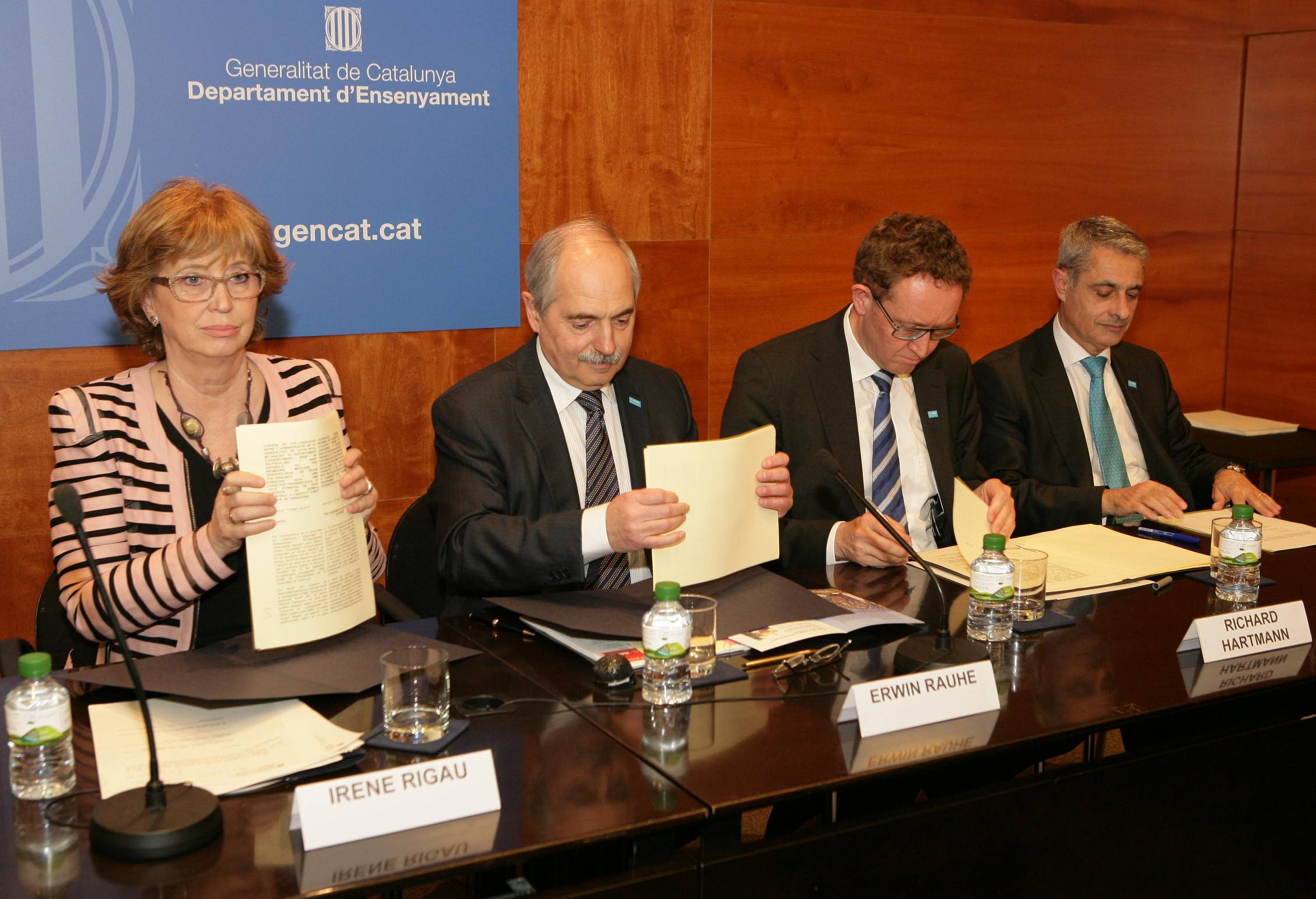 13/03/2015 La consellera d'Ensenyament de la Generalitat de Catalunya, Irene Rigau, y el consejero delegado de BASF Española y máximo responsable de las actividades del Grupo en el Sur de Europa, Erwin Rauhe, junto con el director de Formación Profesional de BASF SE, Richard Hartmann, han renovado el acuerdo para seguir fomentando la FP Dual Transnacional en la modalidad de Grado Superior de Química Industrial. La multinacional química ha sido la compañía pionera en España en ofrecer a los alumnos realizar una parte de la formación en un país extranjero.
