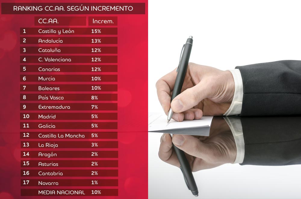 En cuanto al incremento interanual de la contratación, la comunidad autónoma de Castilla y León se llevará la palma, pues para ella se espera un incremento del 15%. También por encima de la media se sitúan Andalucía (13%) y Cataluña, la Comunidad Valenciana y Canarias (12% cada una).