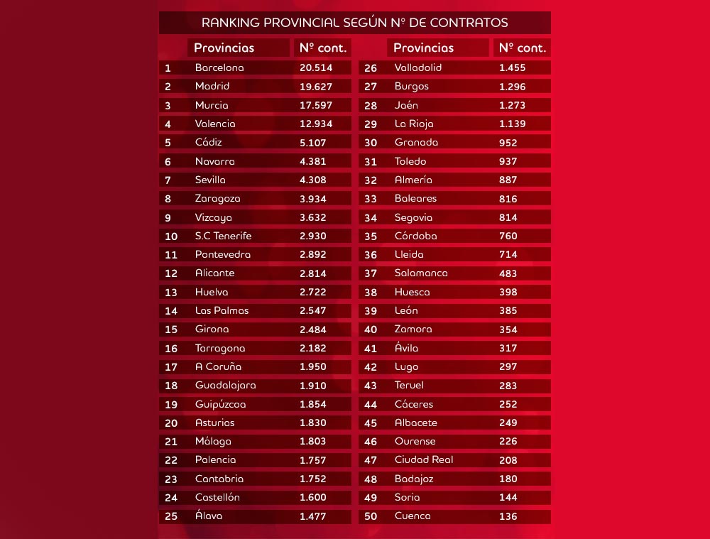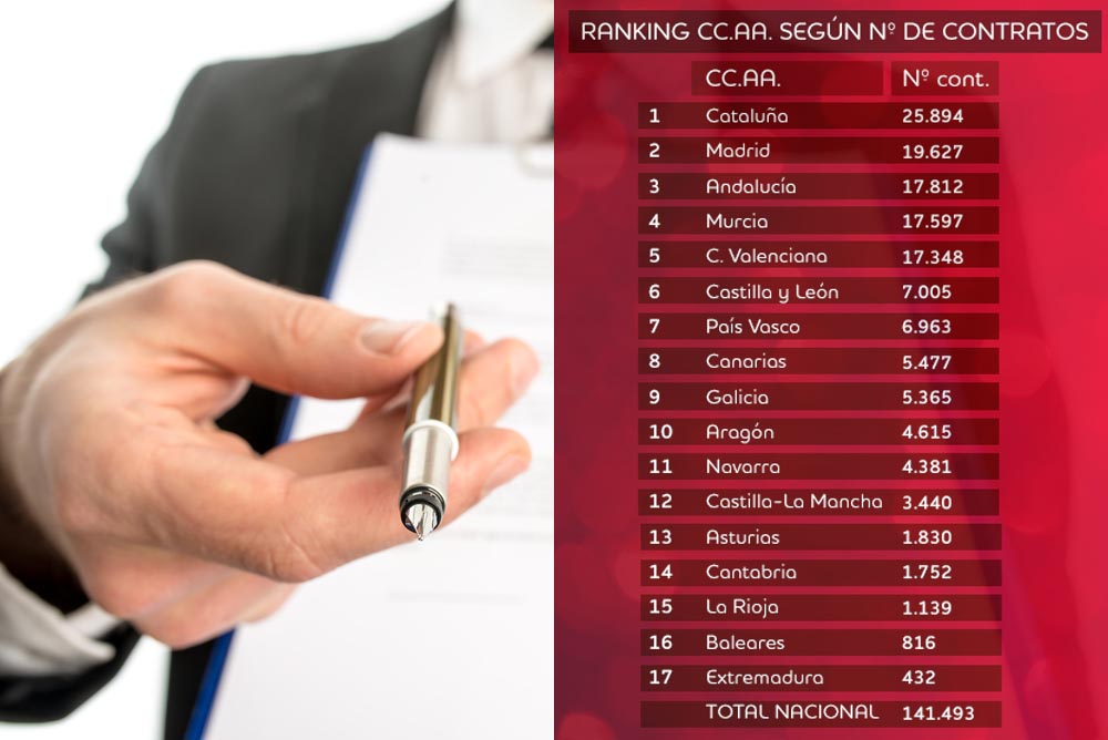 Algunas de esas regiones son Cataluña, la Comunidad de Madrid, Andalucía, la Región de Murcia y la Comunidad Valenciana que en total realizarán cerca de 100.000 contratos, lo que equivale al 71,4% de los contratos a nivel nacional, es decir, 7 de cada 10.