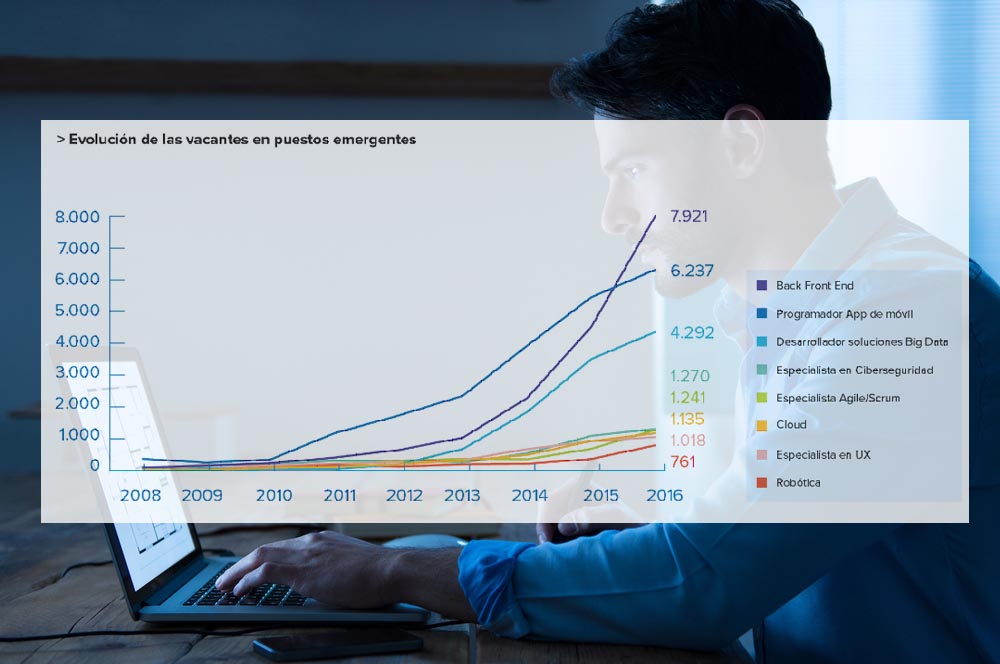 Además, los puestos emergentes vinculados a innovación y tecnología abren nuevas oportunidades tanto a jóvenes como a profesionales con experiencia que quieren reinventarse en el mundo laboral. Según el Informe de InfoJobs y ESADE, la demanda de especialistas en Back/Front End, Programador para móvil, Desarrollador de soluciones Big Data y profesionales del Cloud Computing mantiene su senda creciente de los últimos años.