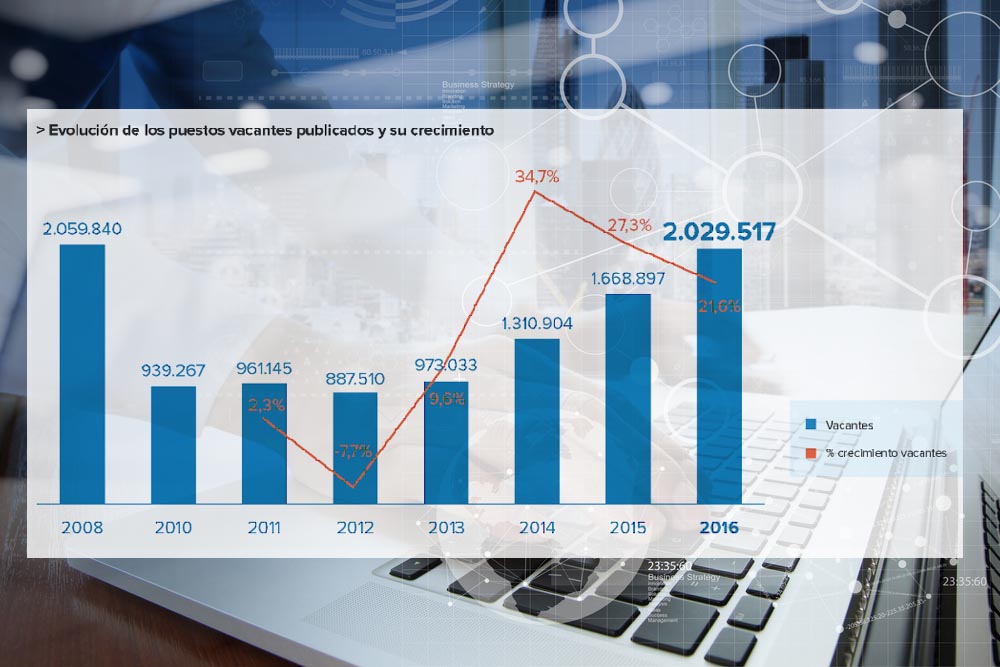 La cifra de vacantes publicadas en InfoJobs en 2016 creció un 21,6% respecto al año anterior y revela un ascenso de 8 puntos porcentuales respecto a 2013 en la modalidad de contratación indefinida, situándose en un 31,7% del total de vacantes. Sin embargo, todavía se sitúa lejos del 48% que representaba en 2008.