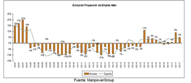 Además, el estudio revela que el 10% de los directivos entrevistados de la zona Noreste prevé aumentar la contratación durante el tercer trimestre de 2017, frente al 79% que no espera ningún cambio en sus equipos y el 2% que prevé reducir su número de empleados. Tras estos resultados, la Proyección de Empleo se situaría en +8%, que una vez aplicados los ajustes estacionales correspondientes, se sitúa en el +5%.