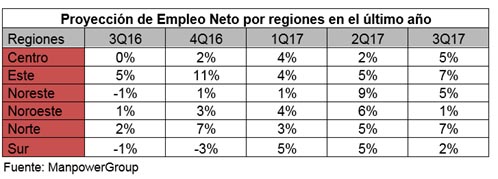 El Estudio realizado por ManpowerGroup divide el país en seis regiones para valorar las previsiones en cada una de ellas: Centro (Castilla-La Mancha y Madrid); Este (Comunidad Valenciana y Murcia); Noreste (Cataluña e Islas Baleares); Noroeste (Asturias, Castilla y León y Galicia); Norte (Aragón, Cantabria, La Rioja, Navarra y País Vasco) y Sur (Andalucía, Extremadura e Islas Canarias).