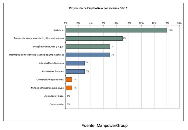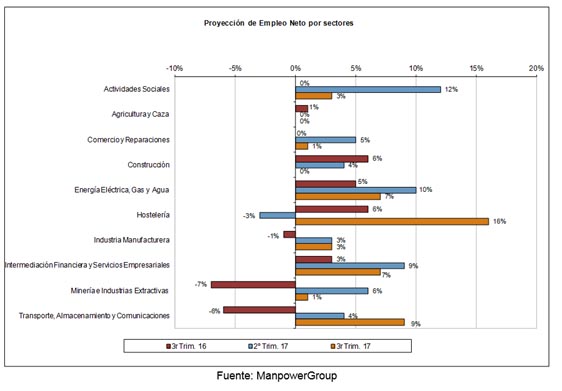 Por su parte, los directivos de Hostelería (+16%) son los más optimistas en las previsiones de contratación. Les siguen los directivos de los sectores de Transporte, Almacenamiento y Comunicaciones (+9%); Energía Eléctrica, Gas y Agua (+7%); Intermediación Financiera y Servicios Empresariales (+7%); Actividades Sociales (+3%); Industria Manufacturera (+3%); Comercio y Reparaciones (+1%) y Minería e Industrias Extractivas (+1%).