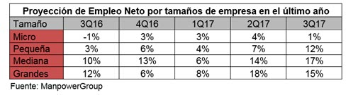 En la clasificación de empresas por número de trabajadores, destaca las previsiones de contratación de los directivos de medianas empresas, con una Proyección de Empleo de Neto de +17%. Les siguen los de las grandes empresas, con un +15%, las pequeñas empresas, con un +12%, y cierran la clasificación los directivos de las microempresas con una Proyección de Empleo Neto de +1%.