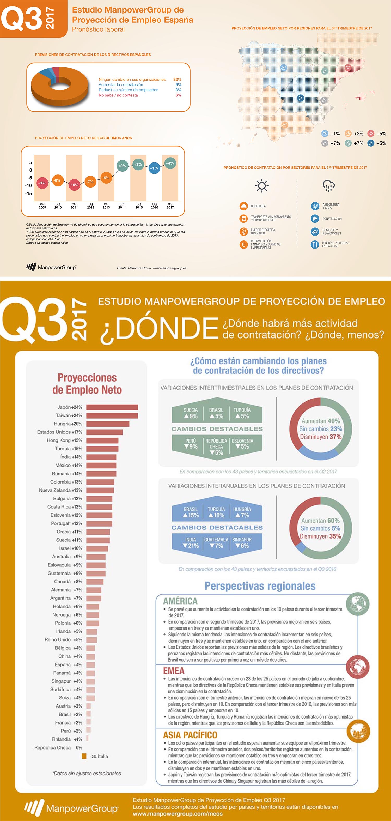 A nivel mundial, los directivos en 41 de 43 países y territorios revelan intenciones de aumentar sus equipos durante el período de julio a septiembre de 2017. Las previsiones más optimistas se registran en Japón (+24%), Taiwán (+24%) y Hungría (+20%).