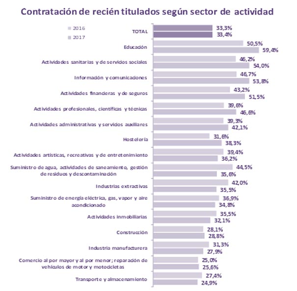 De las más de 3.500 empresas consultadas, un tercio ha contratado titulados sin experiencia previa a lo largo de los últimos cinco años. Además, la contratación de los recién titulados presenta significativas diferencias según la actividad de la empresa.