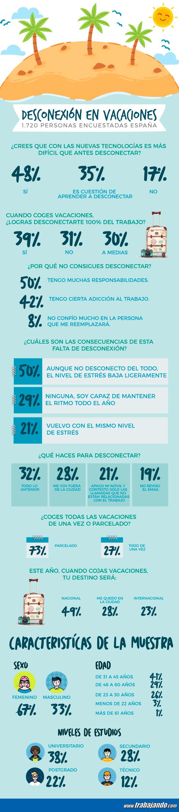 En esta línea, la Comunidad Laboral Trabajando.com – Universia ha realizado una encuesta, en la que han participado 1.720 personas, para conocer en qué medida los españoles disfrutan de su tiempo libre y cómo las nuevas tecnologías afectan a la capacidad de desconexión.