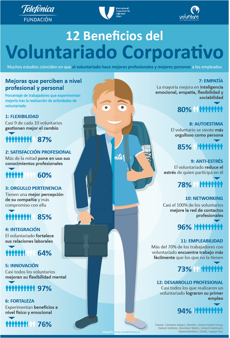 Asimismo, como afirman desde Voluntare (red global de Voluntariado Corporativo): “el voluntariado corporativo, debidamente gestionado, también contribuye al desarrollo profesional de los empleados. Puede tener un impacto importante en la salud psicofísica de los voluntarios, aumentando su productividad y otros aspectos relevantes para la empresa (liderazgo, gestión del cambio o gestión de proyectos), a la vez que responde a problemas sociales reales y tangibles”.