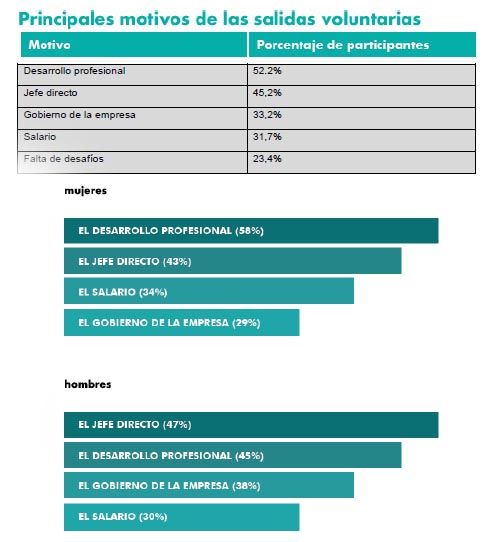 Asimismo, las mujeres señalan la falta de desarrollo profesional como principal motivo de rotación voluntaria mientras que los hombres apuntan más a su jefe directo. Del mismo modo el 38% de las mujeres insatisfechas con su desarrollo profesional asegura que la empresa podría haber hecho más para retenerlas.