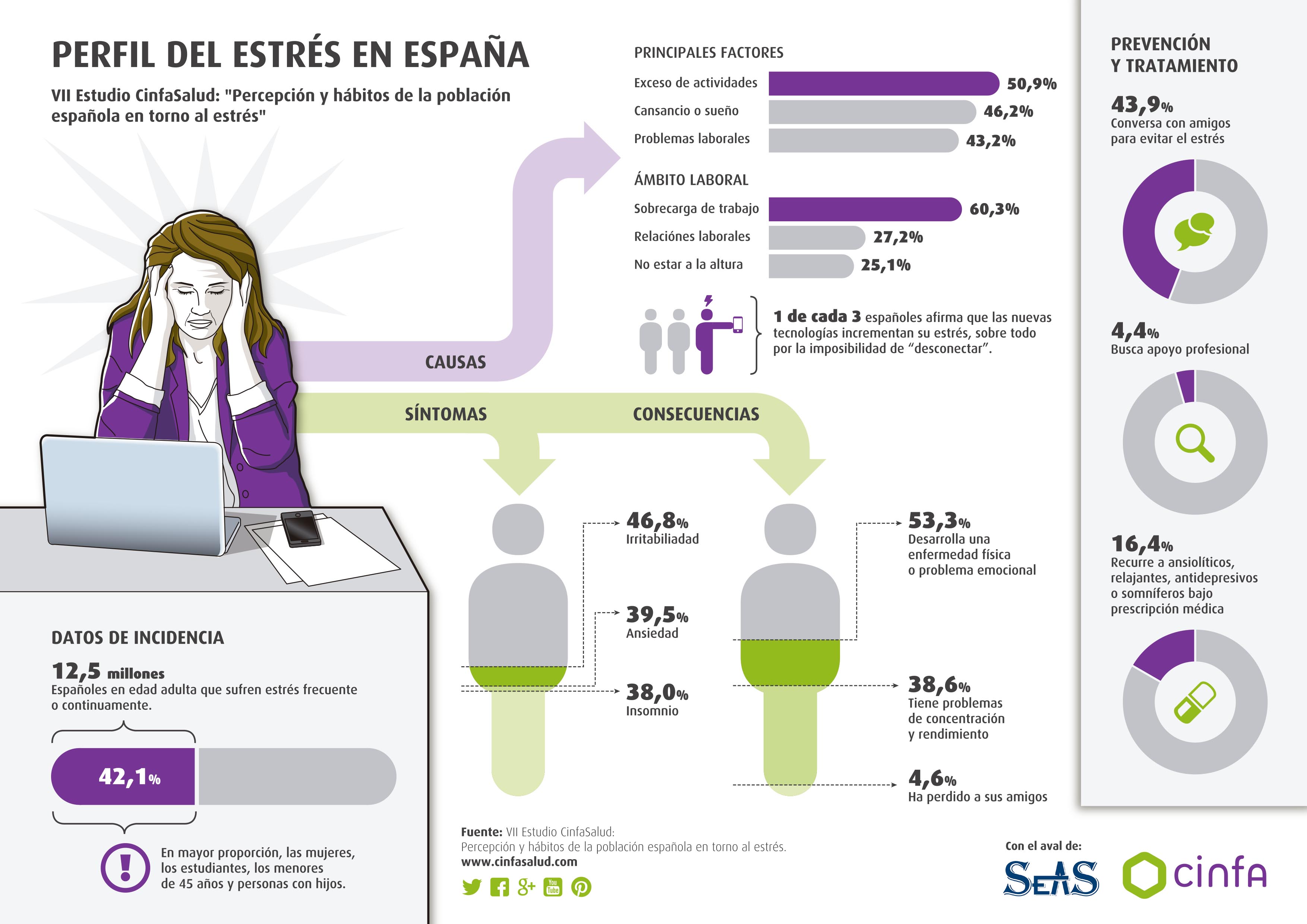 El estudio de Laboratorios Cinfa y SEAS se basa en un cuestionario online realizado a una muestra representativa de 3.009 mujeres y hombres españoles, de entre 18 y 64 años, de todas las comunidades autónomas. De ellos, un 42,1% han manifestado sentirse estresados frecuente o continuamente, lo que equivale a casi 12 millones y medio de españoles (12.413.000) en edad adulta aunque, son las mujeres (48,7%) y los estudiantes (55,6%) son los más afectados.