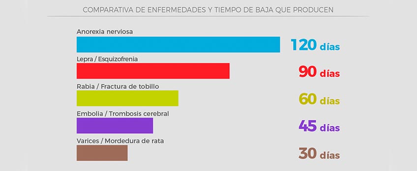 En este sentido, según Acierto, en el cuadro médico que registra las enfermedades más frecuentes y los días de baja que producen, figuran algunas como las anemias por carencia de hierro, delirio por abstinencia de alcohol, síndrome de ansiedad, trastorno de tristeza e infelicidad, flatulencia, eructo y dolores por gases.