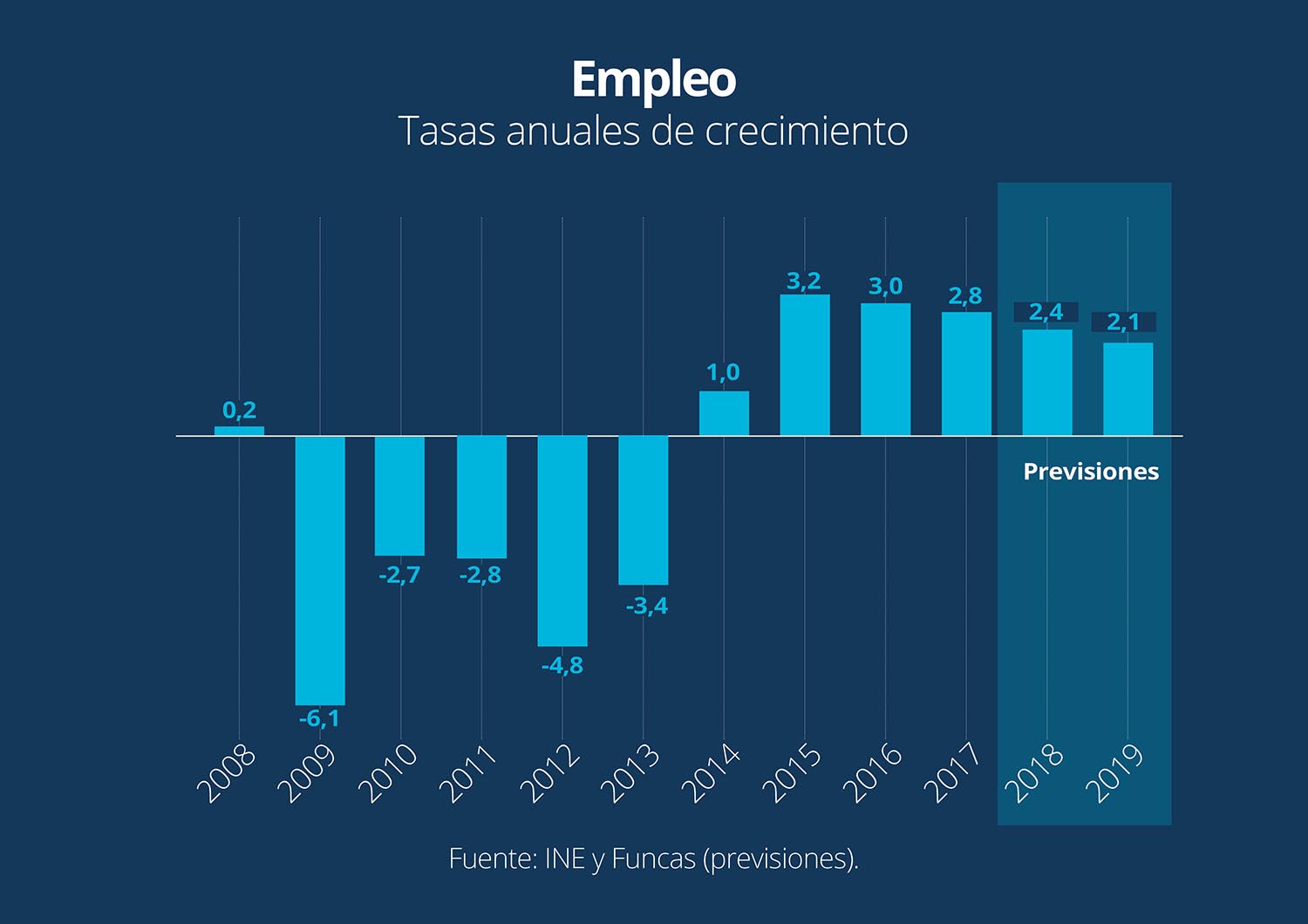 13/03/2018 Según las previsiones de Funcas, la economía española crecerá un 2,8% este año y un 2,4% en 2019, unas tasas de crecimiento que permitirán la creación de 850.000 puestos de trabajo en estos dos ejercicios. Asimismo revela que el número de ocupados aumentará un 2,4% en 2018, una décima más que en la anterior previsión, y un 2,1% en 2019.
