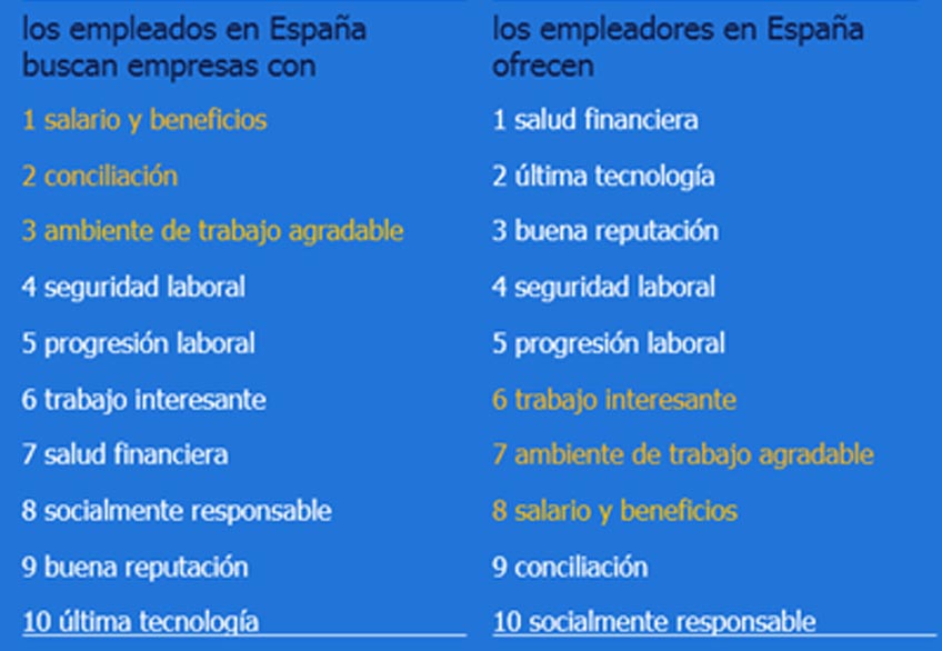 Otro de los aspectos que analiza el informe de Randstad es si existe un desajuste entre las demandas de los profesionales y cómo responden las empresas a estas cuestiones. Según los datos, los atributos más buscados por los ocupados (salario, conciliación y buen ambiente de trabajo), se encuentran en las últimas posiciones de los factores que se atribuyen a las empresas, concretamente, en las posiciones 6ª, 7ª y 8ª.