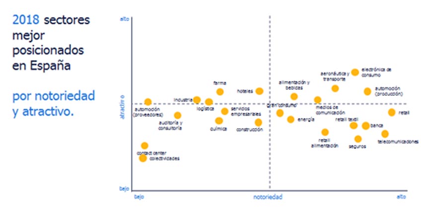 Por otro lado, el informe destaca que electrónica y tecnología, aeronáutica y transporte y farma son los sectores más atractivos para los profesionales para desarrollar su carrera laboral en España. Para obtener los sectores más atractivos para los trabajadores españoles, Randstad ha valorado la notoriedad y el atractivo de estos. En general, se observa una tendencia a la concentración en el atractivo de los sectores, lo que implica que las empresas tienen más dificultades para destacar dentro de su sector y en el conjunto del mercado laboral.