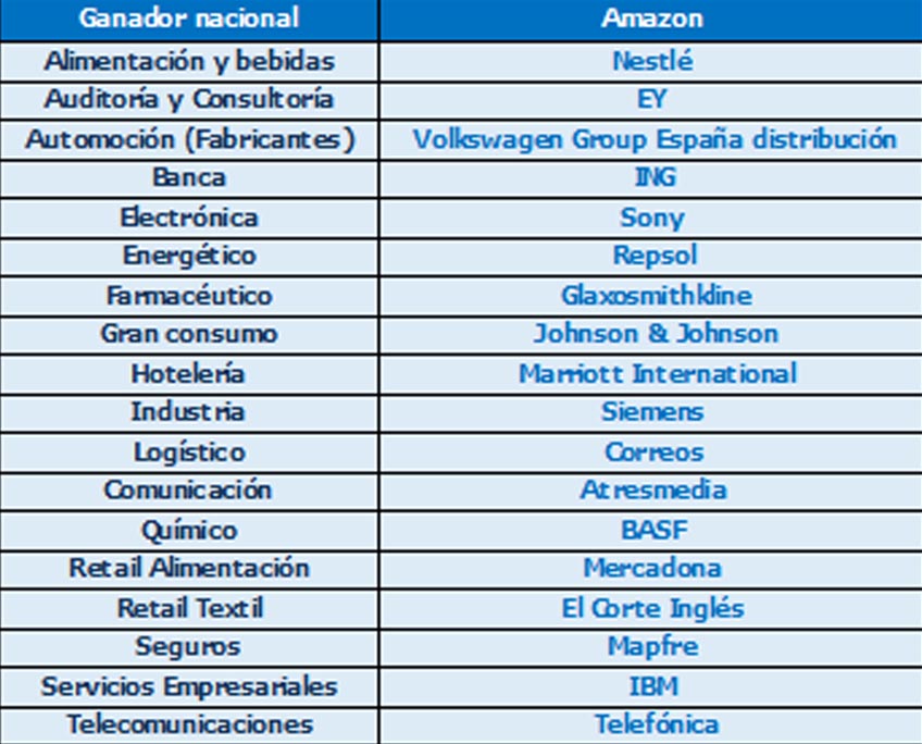 Además de Amazon como ganador nacional, entre las empresas más destacadas por sector de actividad, se encuentran compañías como ING, Sony, Repsol, Siemens, Correos o Mercadona.