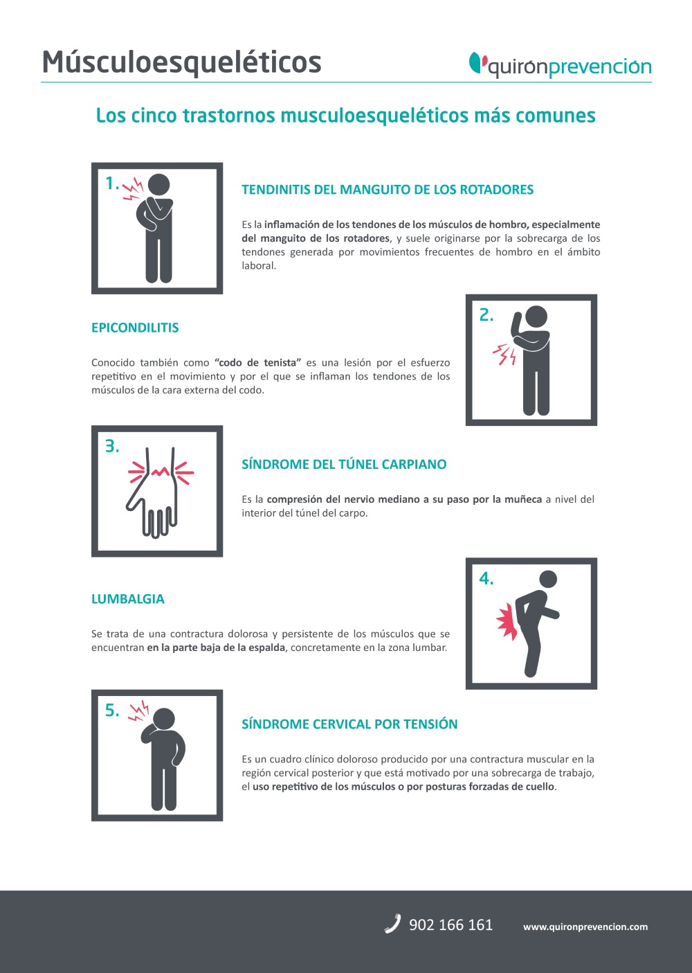Quirónprevención ha revelado los cinco trastornos musculoesqueléticos que con más frecuencia se producen en las empresas. De este modo, en base a los datos del Instituto Nacional de Seguridad e Higiene en el Trabajo, el primero de ellos, la tendinitis, provocada por la inflamación de los tendones de los músculos de los hombros, se produce debido a la sobrecarga que provocan los movimientos frecuentes.