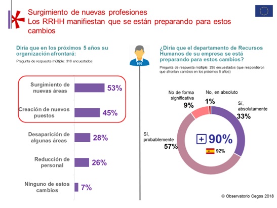 Con estos datos, es de prever que, por lo tanto, el cambio genere incertidumbre en los trabajadores. Sin embargo, los responsables de RR.HH. son más positivos al considerar que la digitalización aportará nuevas áreas y puestos de trabajo en las organizaciones. En este sentido, el 90% manifiesta estar preparados para dicho cambio, un dato que aparece en las organizaciones de todos los tamaños.