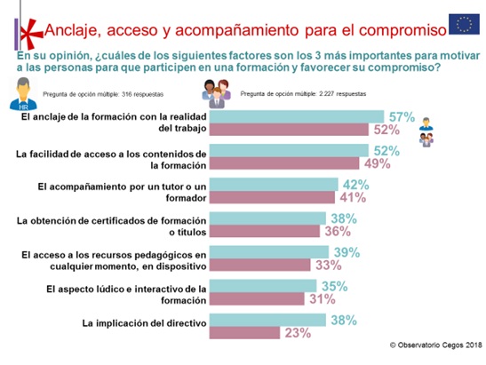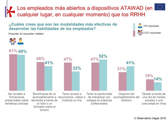 En esta linea, cuando se trata del desarrollo de habilidades, los empleados parecen estar más abiertos a las soluciones de ATAWAD ("en cualquier momento, en cualquier lugar, cualquier dispositivo ") que sus responsables de formación. De hecho, prefieren los formatos presenciales, donde pueden interactuar con otros participantes.