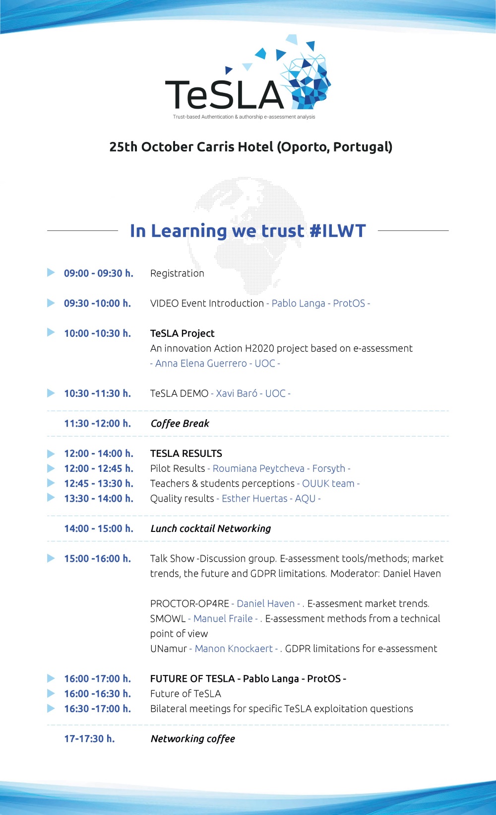 19/10/2018 Tras unos años de trabajo, el proyecto TeSLA será presentado el próximo 25 de octubre en Carris Hotel Oporto (Portugal), en el marco de 'TeSLA International show', un evento organizado bajo el lema “In Learning we trust” .