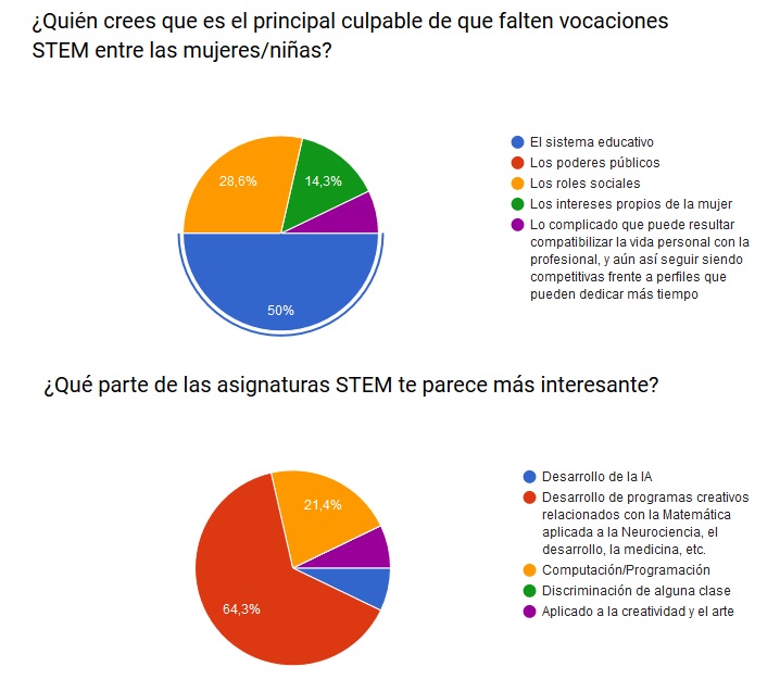 De los resultados se desprende que, para el 78% de las mujeres profesionales presentes en el evento, el sistema educativo actual y los roles sociales prexistentes son las principales causas de que falten vocaciones STEM entre las mujeres/niñas, mientras que un 57% ha apuntado a la importancia de encontrar roles femeninos en los que las niñas puedan fijarse para dedicarse a estas materias.