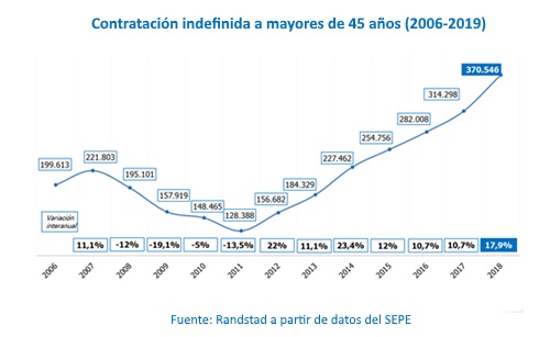 "Cuando se analiza la serie histórica, se detecta que tras registrar un repunte en 2007 (11,1%), los contratos firmados por los mayores de 45 años descendieron más de un 42% durante cuatro años consecutivos, hasta registrar la cifra más baja en 2011 (128.388). Desde ese ejercicio, la tendencia cambió y este tipo de contratación ha aumentado durante siete años consecutivos hasta superar los 370.000 contratos en 2018, la cifra más elevada de la historia en España", explican desde Randstad.
