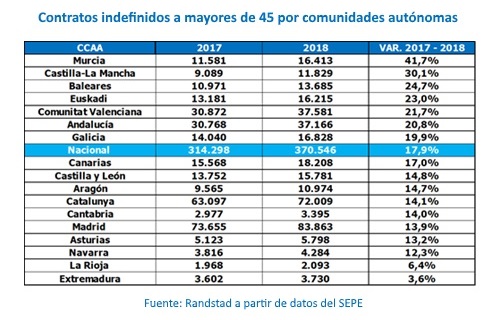 A nivel provincial, el análisis de Randstad destaca que todas las provincias registraron incrementos en la contratación indefinida de mayores de 45 años con respecto a 2017 excepto Cáceres, con un ligero descenso del 3,7%. Las provincias que experimentaron mayores aumentos fueron Albacete (85,9%), Granada (42,7%) y Murcia (41,7%). Los crecimientos más discretos tuvieron lugar en Cádiz (3,9%), Cuenca (4,5%) y Lleida (5,8%).