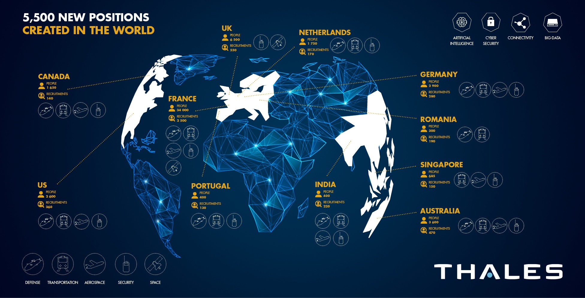27/02/2019 Grupo Thales ha puesto en marcha una nueva campaña de contrataciones a nivel mundial, y que supone la creación de 5.500 nuevos puestos de trabajo en todo el mundo. En este sentido, según detallan, aunque la iniciativa estará centrada principalmente en Francia, también comprende la creación de empleo en Europa (Reino Unido, Alemania, Países Bajos), Australia, Sudeste de Asia, India, Estados Unidos y Canadá.