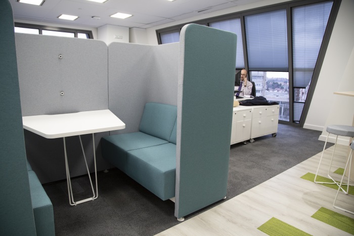 Por lo que respecta a los espacios de colaboración, están pensados como puntos de encuentro informal y como lugares para colaborar con otros equipos. "Están diseminados por toda la oficina y se disponen, por ejemplo, como mesas altas entre los puestos de trabajo, sofás de trabajo colaborativo o la novedosa Contemplation Room", explican fuentes de la compañía. Esta última, ubicada en la cuarta planta, alberga la zona de vending, en la que se han instalado asientos en grada y pizarras de cristal para fomentar la creatividad en procesos de desarrollo de ideas y dinámicas de equipo.