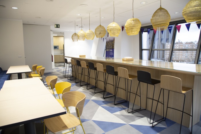 Otro espacio es la Cantina, destinada a ser utilizada tanto por los empleados a las horas de la comida como aprovechada para reuniones informales y para la celebración de eventos internos y otros con brokers y clientes.
