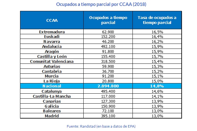 20/03/2019 Randstad ha realizado un informe sobre la tasa de profesionales que se encuentran trabajando a tiempo parcial en España, teniendo en cuenta la comunidad autónoma en la que reside y su edad. Además, ha comparado la tasa de este colectivo de profesionales con la media europea. Para ello, ha analizado los datos de la Encuesta de Población Activa (EPA) y de Eurostat desde 2008.
