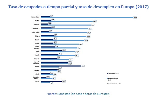 Es el caso de Países Bajos, que es el país europeo que registra la mayor tasa de empleados con jornada parcial (49,8%), el índice de desempleo se sitúa en el 4,9%. Austria, Alemania y Dinamarca muestran un comportamiento similar, con tasas superiores al 25% e índices de desempleo por debajo del 6%.