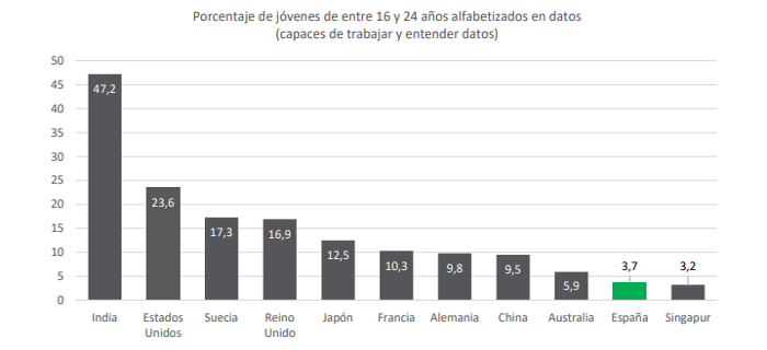 Los jóvenes españoles son los segundos peor preparados de todo el mundo para trabajar con datos: únicamente el 3,2% se siente capaz de leer, entender, compartir y analizar datos, superando únicamente a los de Singapur (3,2%) y muy por detrás de los indios, que lideran el ranking (47,2%), y de otros países europeos, como Suecia (17,3%), Reino Unido (16,9%) o Francia (10,3%), según el DLI publicado en el Qlik y la escuela de negocios Wharton.
