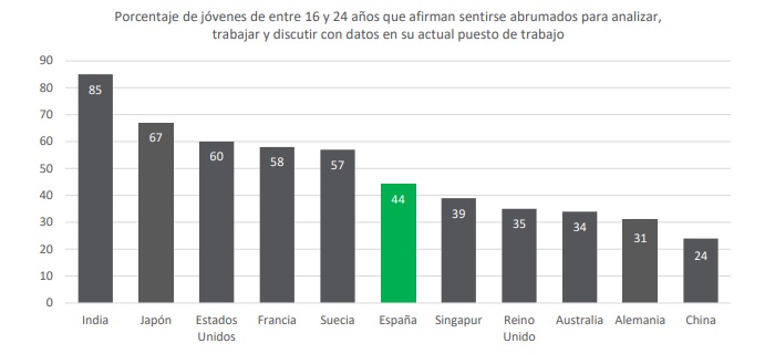 Estas cifras, junto con la baja tasa de alfabetización de datos nacional (3,2%), sugieren una baja concienciación entre la juventud española de la importancia que los datos cobrarán en sus carreras profesionales. Finalmente, el porcentaje de jóvenes españoles que se siente abrumados por los datos en su entorno laboral es del 44%.