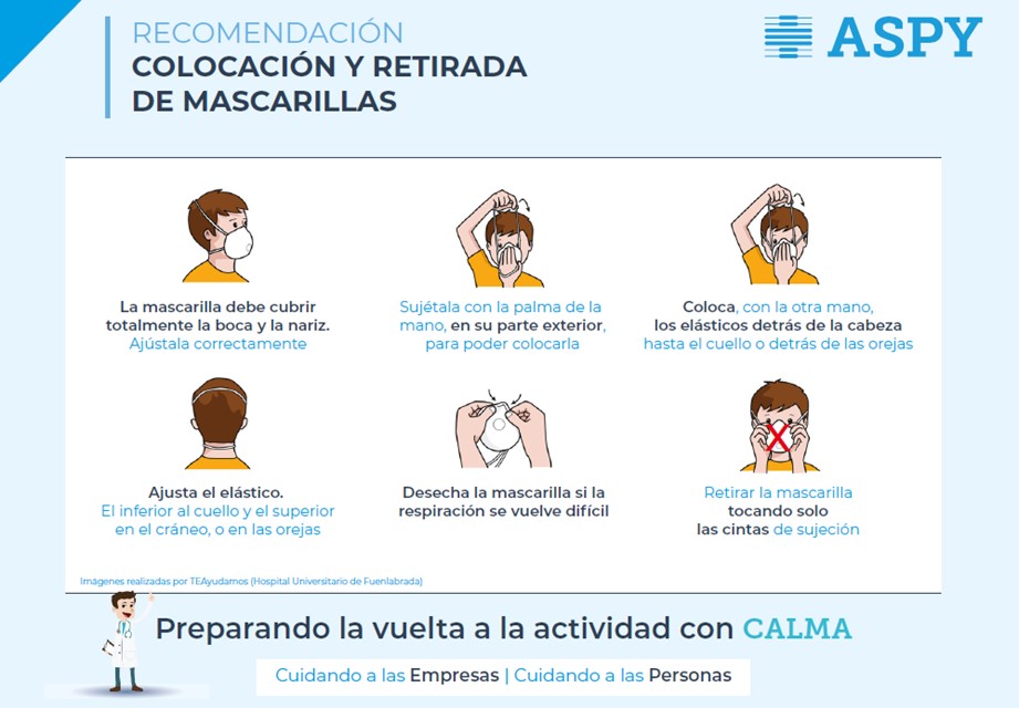 Además, la guía rápida de Aspy aclara dudas sobre el uso de mascarillas, los guantes de protección y soluciones hidroalcohólicas para el lavado de manos.