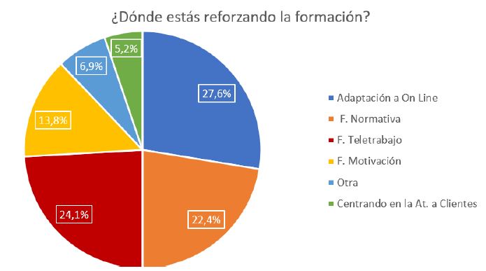 Todos destacan la rápidez en la adaptación a la nueva realidad y cómo se han orientado sus programas formativos hacia el canal online, centrándose especialmente en temas normativos, en la optimización del teletrabajo y en aumentar la motivación.