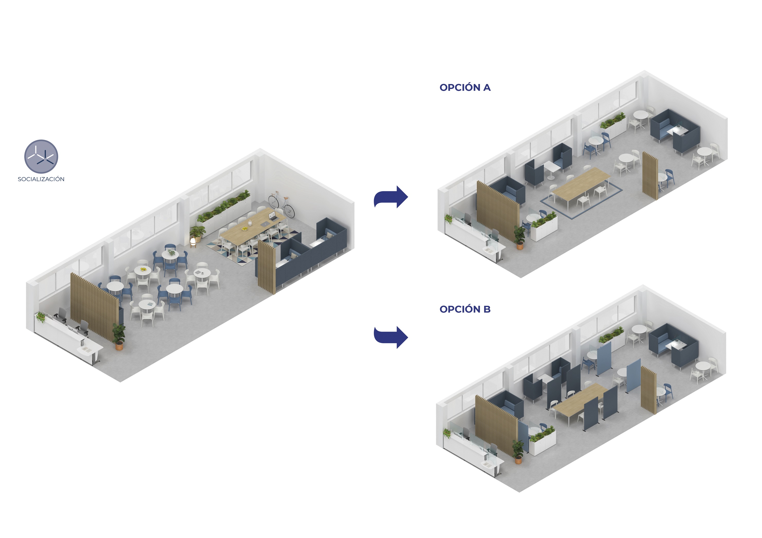La aplicación y cumplimiento de todas estas medidas resulta más difícil y compleja cuando se habla de los espacios de socialización, opina Soledat Berbegal, Consejera y directora de reputación de marca de Actiu. “Mantener el control en tu puesto de trabajo resulta más sencillo -porque es un espacio específico de cada usuario, donde se realizan tareas muy concretas. El reto está en las llamadas zonas de socialización, de relación personal, donde se baja la guardia o desaparecen las reglas.”