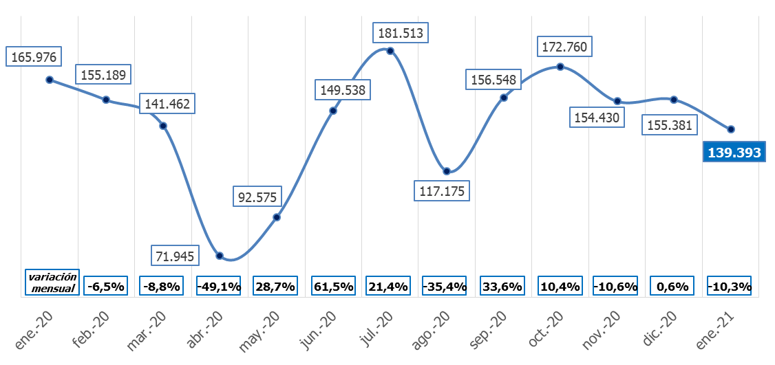 Analizando la evolución de la contratación desde enero de 2020, se aprecia que el indicador comienza a caer a la vez que el aumento de casos de covid-19, llegando a registrar su volumen más bajo, cerca de 72.000 firmas, en abril, el mes más crudo de la primera ola y del confinamiento. Desde entonces, comenzó a experimentar un crecimiento considerable, hasta superar los 181.500 contratos en julio, el máximo del periodo estudiado. Tras la considerable caída de agosto (117.175 firmas), el indicador volvió a crecer, alcanzando la segunda cota más alta en octubre, 172.760 contratos para después caer hasta las cerca de 140.000 firmas actuales.