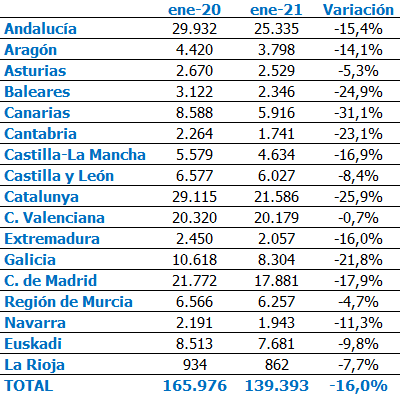 Ya con descensos menos pronunciados que la media nacional, se encuentran Andalucía (-15,4%), Aragón (-14,1%), Navarra (-11,3%), Euskadi (-9,8%) y Castilla León (-8,4%). Las menores caídas tuvieron lugar en La Rioja (-7,7%), Asturias (-5,3%), la Región de Murcia (-4,7%) y la Comunitat Valenciana, con un descenso de apenas siete décimas.