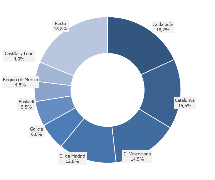 A distancia, con volúmenes más discretos y por debajo de los 10.000 contratos, se sitúan Galicia (8.304), Euskadi (7.681), la Región de Murcia (6.257), Castila y León (6.027), Canarias (5.916), Castilla-La Mancha (4.634) y Aragón (3.798)