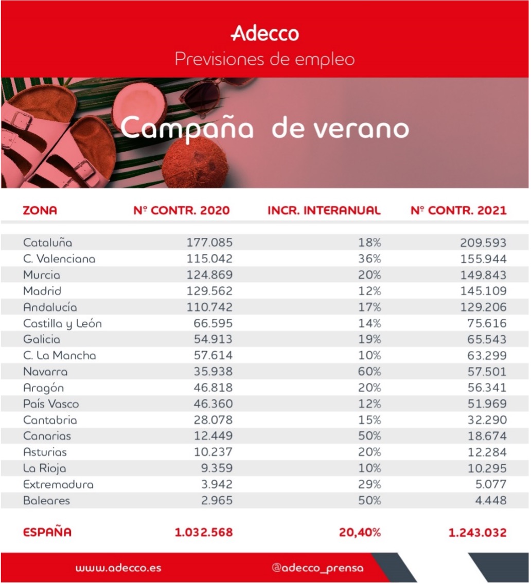 Así, en este contexto, Adecco, líder mundial en la gestión de Recursos Humanos, prevé que durante los meses de junio, julio, agosto y septiembre se experimente un incremento interanual en la contratación del 20,4%, que supone la firma de más de 1.243.000 contratos en nuestro país, de los cuales casi 147.000 estarán vinculados a la campaña de rebajas, un 14,5% más con respecto al año pasado.