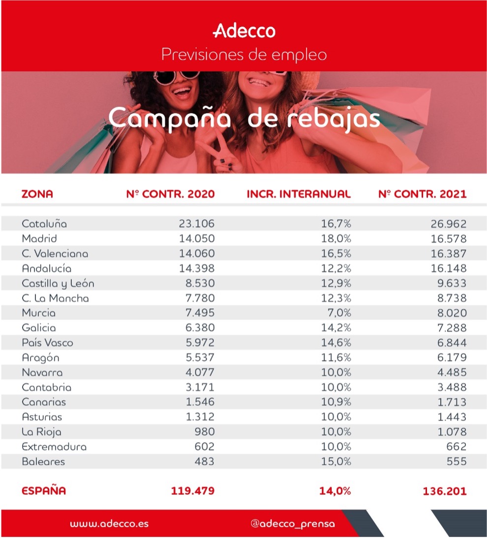Las rebajas siempre suponen un importante repunte del empleo en nuestro país. En esta época, las atractivas ofertas de las diferentes empresas favorecen el aumento del consumo que se traduce en un crecimiento notable en la demanda de trabajadores temporales para hacer frente a esas necesidades. Y como ya hemos comentado, Adecco prevé que estas rebajas generen alrededor de 136.200 contratos, lo que supone un incremento interanual del 14%.